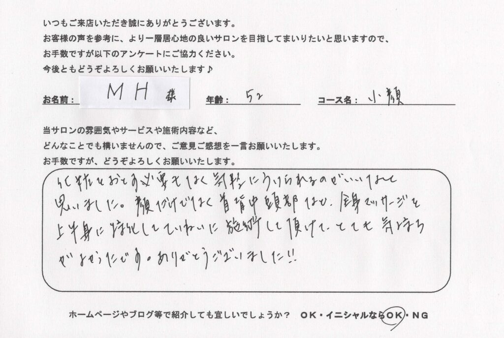 こちらは、小顔リフト整顔コースを定期的に受けて頂くようになったお客様のお声です。